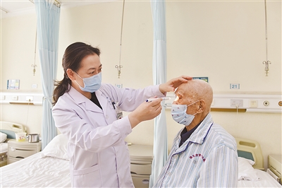 百岁老人的光明之旅 已过百岁生日的杨先生身体硬朗,精神状态好。美中不足的是双眼患上严重白内障,视力只有0.08,严重影响正常生活。 去年,市一中心医院眼一科主任韦秋红为其左眼做了白内障手术,术后左眼视力达到0.6。近日,杨先生又在孩子的陪伴下再次找到韦秋红,想把右眼的白内障也治好。 韦秋红介绍,老人百岁年龄增加了手术难度和风险,手术承受能力下降,不过如果术中处理得好,也完全没有问题,视力可以逐渐恢复。术中影像可观 察到,老人眼睛的白内障核非常硬。韦秋红运用娴熟的劈核、超声乳化等手术技巧,特别注意保护角膜,仅用了9分钟时间,就顺利植入折叠晶体,完成手术。“一定要高效快速完成手术,这样可以减少手术损伤,避免并发症,保证手术效果。”韦秋红说。经过恢复和检查,老人视力已恢复到0.5,可以在光明的世界里享受美好的晚年生活。 赵洁 眼一科主任韦秋红为老人检查