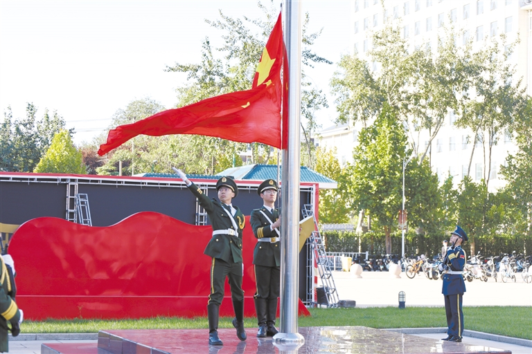 10月1日上午8时,华北电力大学保定校区举行庆祝中华人民共和国成立75周年升旗仪式。师生们屏息凝神,共同等待国旗升起的庄严时刻。