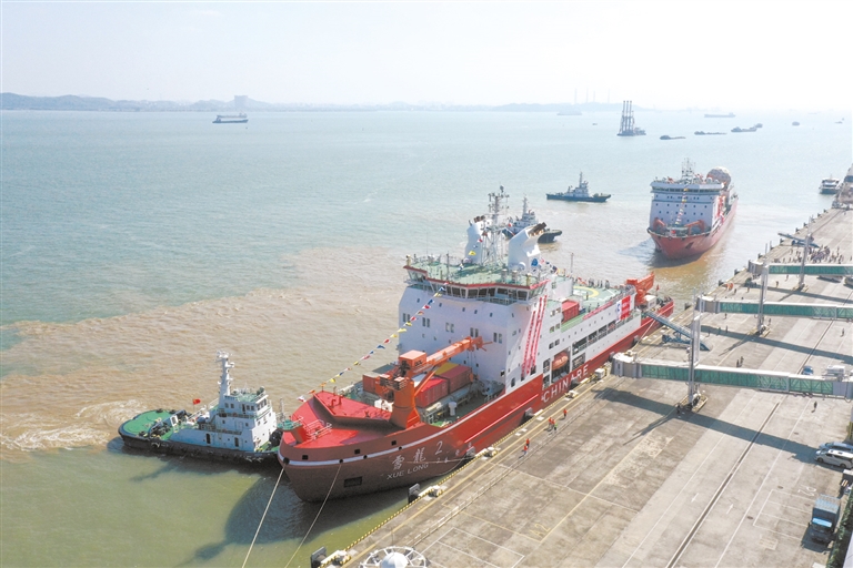 11月1日,“雪龙”号和“雪龙2”号船从广州南沙国际邮轮母港码头出发(无人机照片)。
