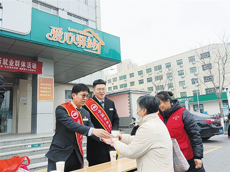 12月12日,农行定州市支行在24小时爱心驿站开展“冬日送温暖”服务活动。活动现场,工作人员将一杯杯热腾腾的“爱心豆浆”送到环卫工、外卖小哥等户外劳动者中手中,为他们送去温暖和关怀。