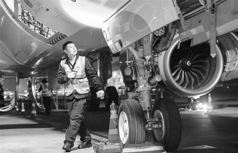 1月12日,在海口美兰国际机场停机坪上,南航工程技术分公司机务工程师对飞机进行深度检查。