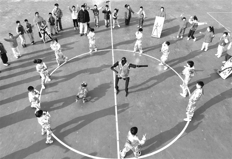 2025年2月13日,武汉市未来实验美林小学学生与智能机器狗和人形机器人共舞(无人机照片)。 新华社发