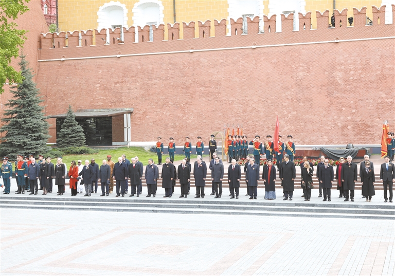 庆典结束后,习近平同其他国家领导人一起从红场来到亚历山大花园,向无名烈士墓献花,并肃立默哀。随后,各国领导人集体合影留念。