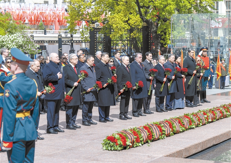 当地时间5月9日,俄罗斯举行盛大庆典,纪念苏联伟大卫国战争胜利80周年。国家主席习近平和来自世界20多个国家及国际组织领导人应邀出席庆典。庆典结束后,习近平同其他国家领导人一起从红场来到亚历山大花园,向无名烈士墓献花,并肃立默哀。 新华社记者 翟健岚 摄