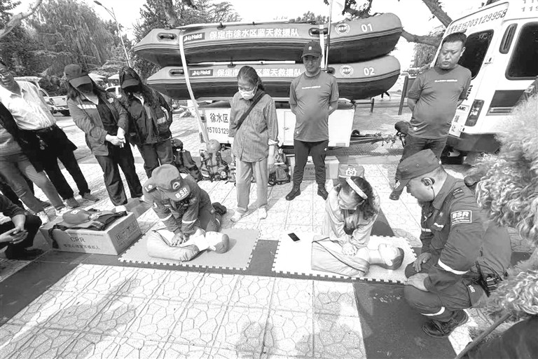 防灾减灾集中宣传活动现场,徐水区蓝天救援队队员开展心肺复苏急救现场教学。 闫森 摄