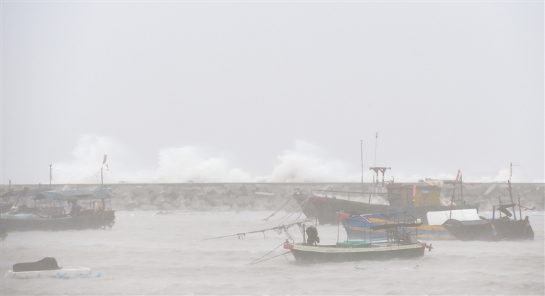 6月13日,渔船在海南省乐东黎族自治县莺歌海镇亲水广场附近海域停泊避风。 新华社发