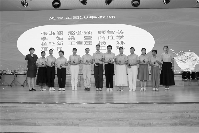 该园特别设立“光荣在园20年”奖项,11位资深教师获颁纪念奖杯。她们数十年如一日的坚守与奉献,成为市二幼教育事业的坚实基石。同时,2025年上半年优秀班主任、优秀教师、优秀后勤员工等18位先进个人,14位“学习之星”“全勤班级之星”“宣传之星”和4个优秀班集体依次登台领奖,现场掌声此起彼伏。在幼儿园负责人带领下,全体教职工高举右拳,庄严宣读“大力弘扬教育家精神”誓词。