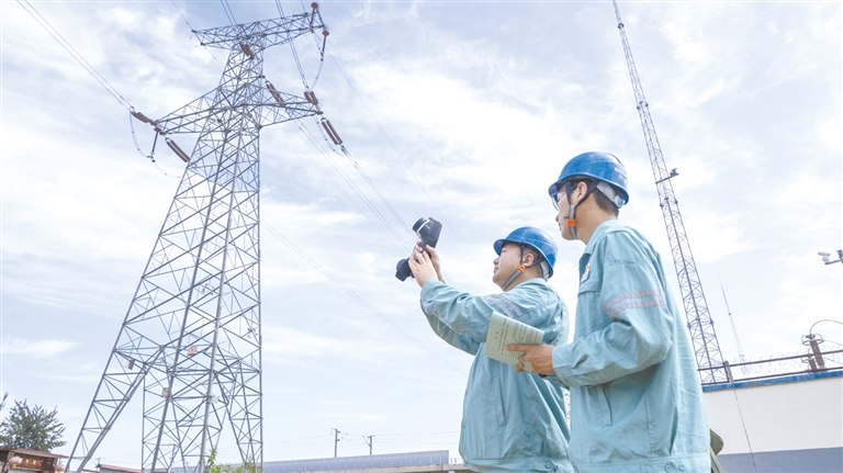 国庆中秋假期,国网保定供电公司输电运检中心的张立、段欧文师徒俩坚守岗位,利用红外线测温仪进行巡检。 庞龙光 鲍雪娜 摄