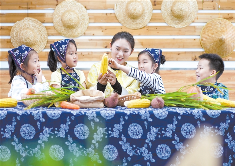 10月14日,江苏省泰州市姜堰区实验小学教育集团城南校区的老师带领学生辨识粮食。