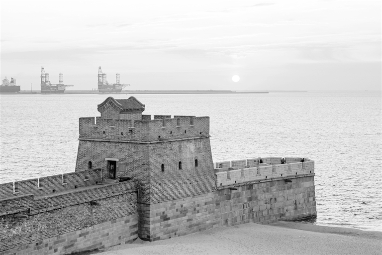 10月26日,沐浴在晨光中的河北秦皇岛山海关老龙头,与海面光影交错,尽显雄浑气象。
