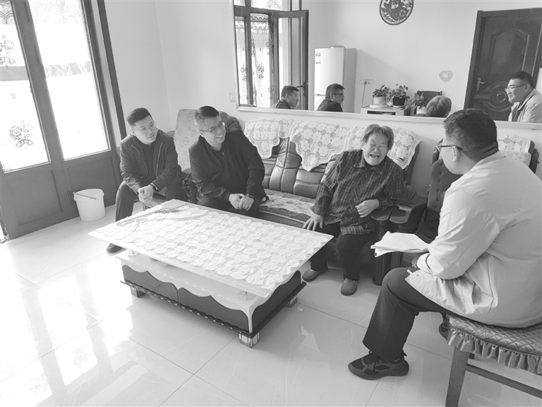 郝兆建(右1)到村民家中走访。 受访者供图
