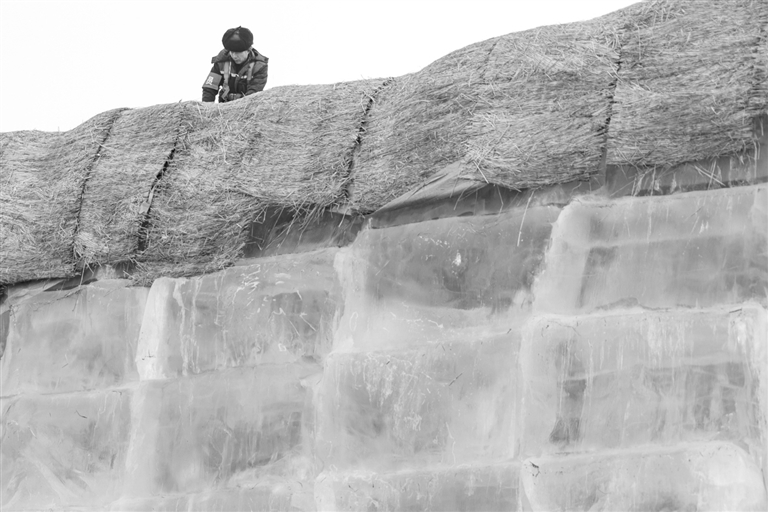 11月24日,在哈尔滨冰雪大世界存冰场,工作人员拆除冰垛外层保温材料。