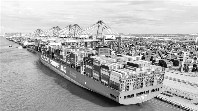11月11日,一艘海轮在钦州港集装箱自动化码头卸货(无人机照片)。
