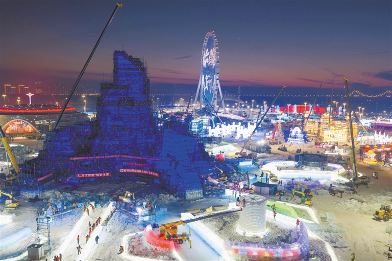 这是12月10日拍摄的哈尔滨冰雪大世界主塔施工现场(无人机照片)。