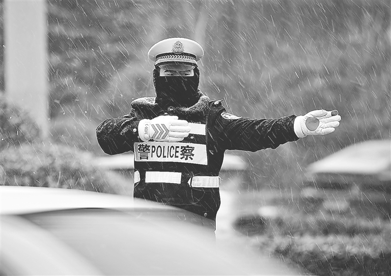 ◀风雪中,公安交警保障道路通行秩序与安全。 张嗣佳 摄