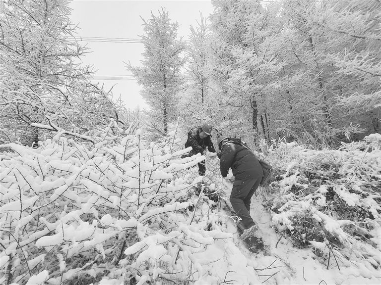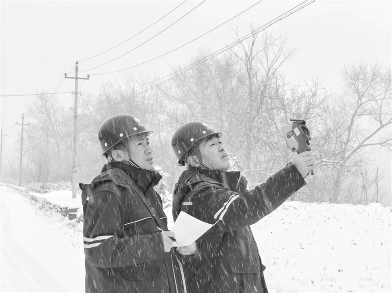 ▲国网保定供电公司员工在涞源县对供电线路进行雪中特巡。 受访单位供图