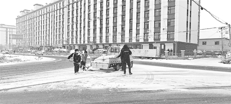 ▲曲阳县交通运输局工作人员撒布融雪剂。 刘玉乾 摄