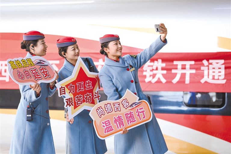 12月26日,乘务员在由西安开往延安的西延高铁首发列车前合影。 新华社发