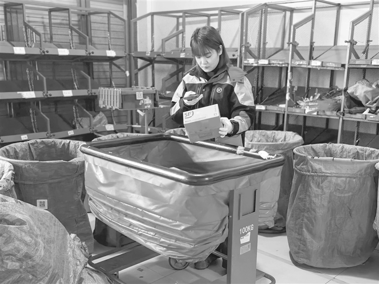 沈冬鸽在进行快递分拣工作。 受访者供图