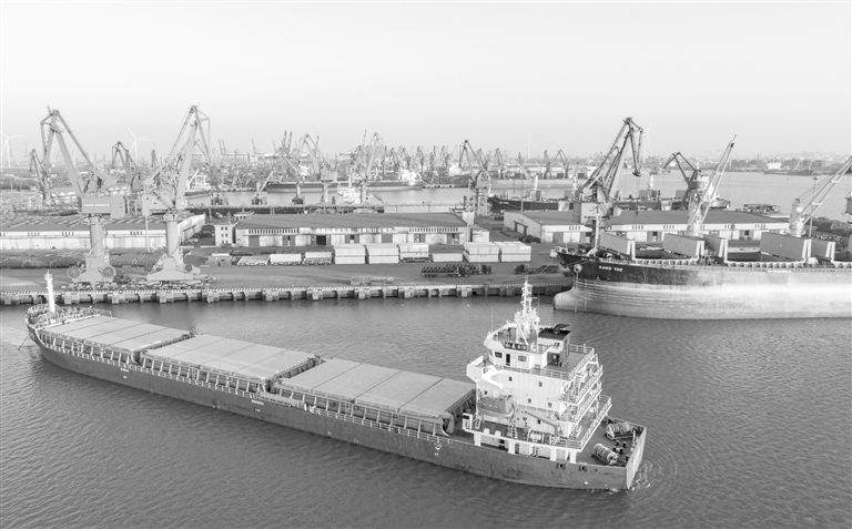 1月2日,一艘货轮从天津港第一港埠有限公司码头离泊(无人机照片)。 元旦假期,天津港各大港区巨轮频靠,一派繁忙景象。工人奋战一线抢抓生产,力争新年“开门红”。 新华社发