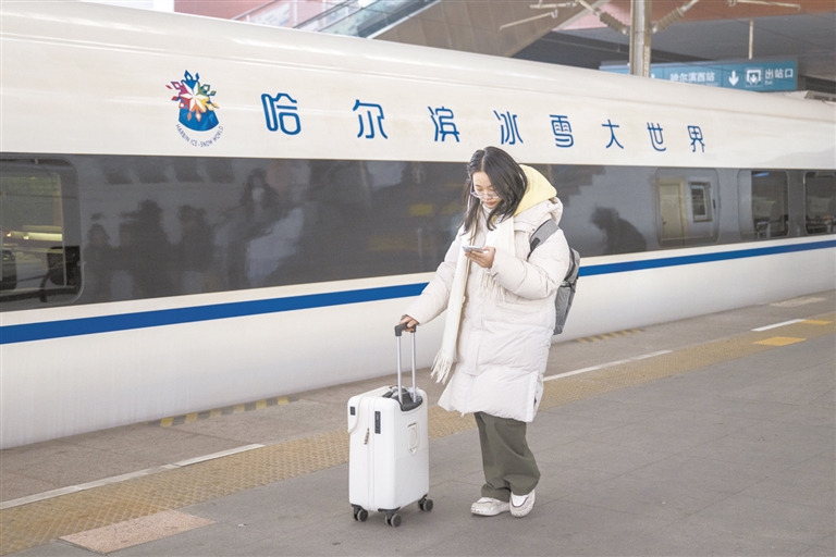 1月4日,在哈尔滨西站,旅客准备乘坐“哈尔滨冰雪大世界”主题高铁列车G1276。