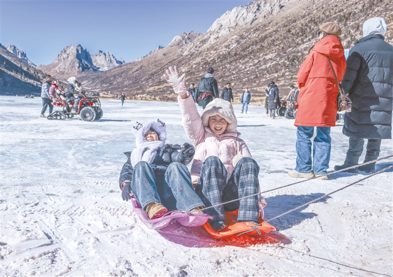 在四川阿坝县莲宝叶则景区,小朋友在冰面上玩耍(1月11日摄)。