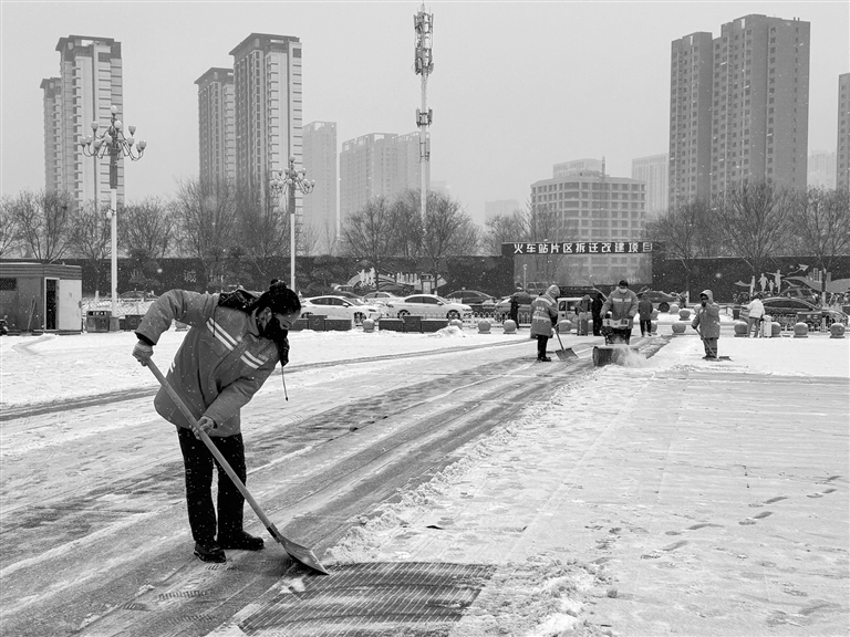环卫工人们在广场上奋力铲雪。 郝长鸿 摄