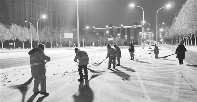 时间在铁锹与地面的摩擦声中、在除雪机的轰鸣中流逝。东方渐白,晨曦微露,一条条黑色沥青路面已如脉络般清晰呈现,桥梁无冰,巷弄无阻。早出的市民踏上干净、安全的路面。那些彻夜未眠的“橙色卫士”,有的仍在巡回清理残雪。