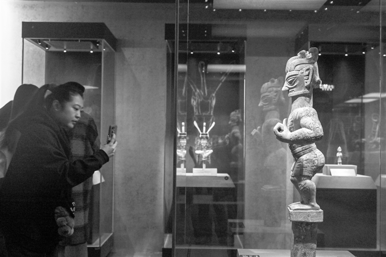1月18日,观众参观展出的青铜着裙立人像。