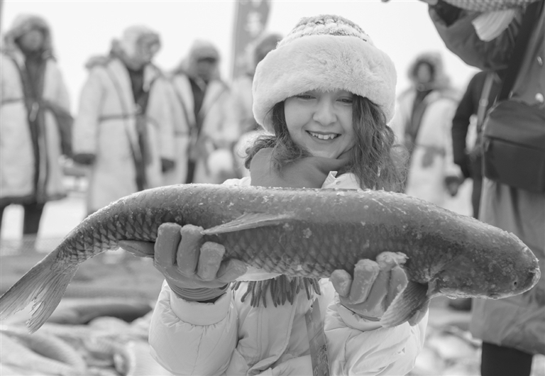 1月18日,在博斯腾湖冰面上,游客手捧刚打捞上来的博斯腾湖鱼。