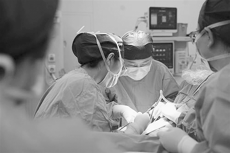 市第一中心医院眼眶、泪道、眼整形、眼肿瘤科沈立台主任团队核心成员刘媛医生(右二)为患者实施手术。 王拓 摄