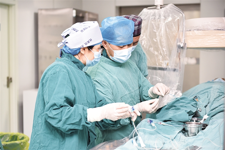 该院卒中中心开通“脑卒中绿色通道”,其动脉取栓技术大幅降低致死致残率。图为神经内一科主任刘永刚为脑梗塞患者取栓。