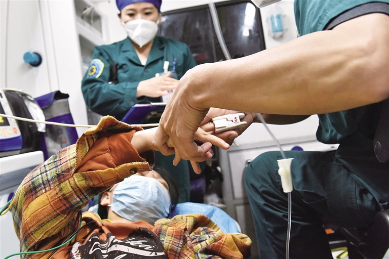 途中,刘其炎用平板电脑通过5G网络,将患者的生命体征数据实时传输至一中心医院急诊科监视屏。“下壁心肌梗死!快!通知胸痛中心值班医生!联系绿色通道抢救!”……整个抢救过程中,一中心医院“上车即入院”的举措,为院内的急诊科医护人员留出了充分的准备时间。救护车到达后,急诊科迅速为患者实施气管插管、心肺复苏机辅助等措施。当老人恢复窦性心律后,随即将其转入心内导管室。心内科团队急行冠脉造影,发现其心肌灌注差,立即实施主动脉内球囊反搏术保障脏器供血……20分钟介入手术,最终将老人从死亡边缘拉回。