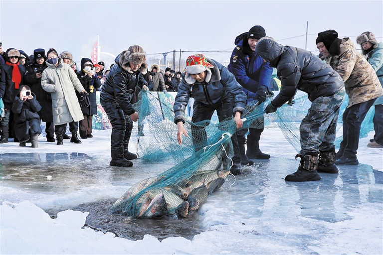 1月23日,作为黑龙江省“冷水鱼·冬捕季”分会场之一,黑龙江省同江市在街津口赫哲族乡修恩湖畔举行冬捕活动。本次活动融合民族渔猎、民俗体育等内容,让人们沉浸式领略冰雪盛景,感受赫哲民俗文化魅力。