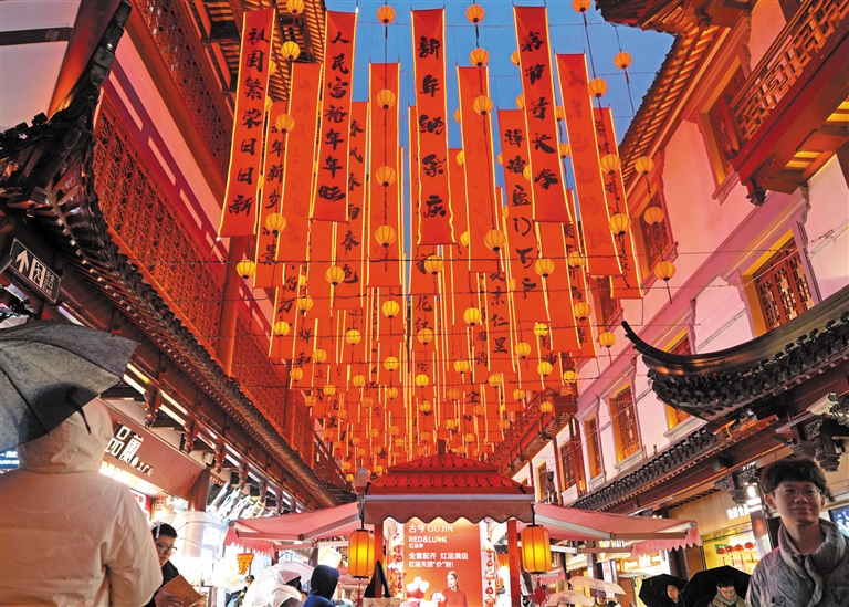 1月26日,豫园灯会上的春联与流光溢彩的花灯营造出新春的喜庆氛围。