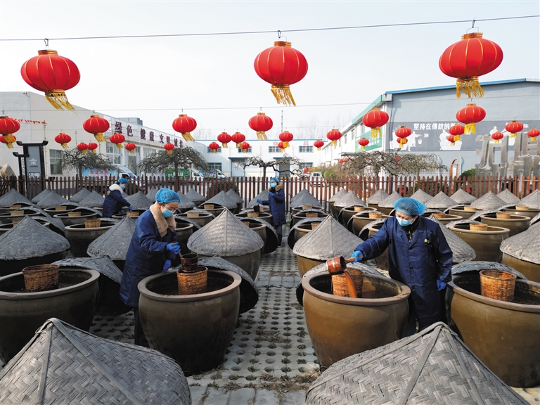 1月29日,滕州市一家传统酱油酿造企业的工人在晾晒场翻晒浇淋酱油。