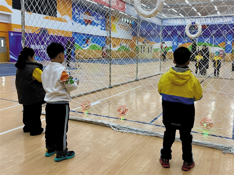 来自全市多所学校、无人机俱乐部的近百名“10后”小选手打破场地边界,将足球场搬至三维空中,以无人机为“球员”、遥控器作“双脚”,上演精彩的空中竞技。