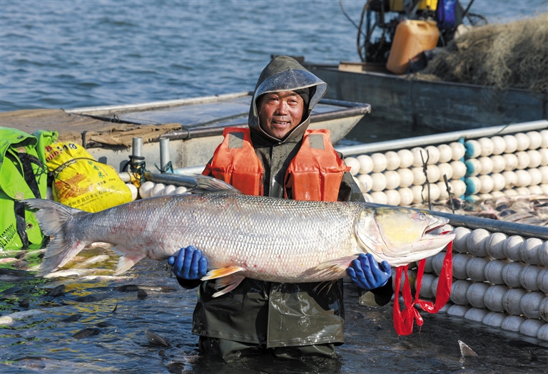 1月31日,渔民在2026溱湖湾冬捕活动现场展示捕获的大鱼。