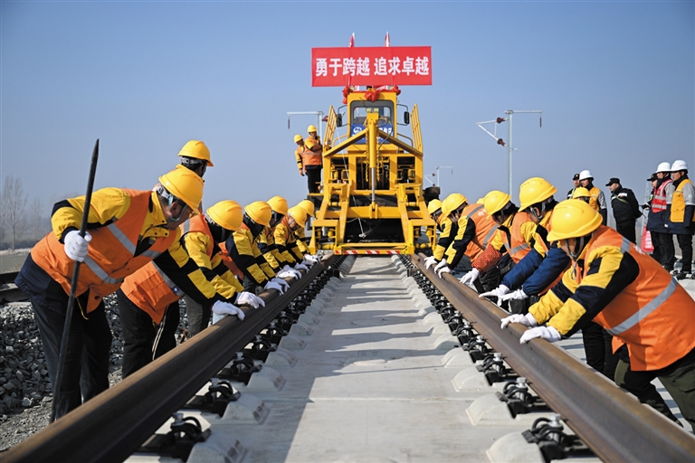 2月1日上午,在河北省保定市顺平县的雄忻高铁建设现场,中铁三局集团施工人员将首对500米长钢轨平稳、精准地铺设在无砟道床上,标志着雄忻高铁正式进入铺轨施工阶段。