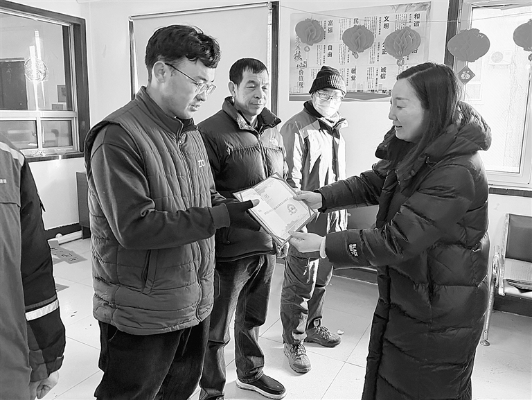 向阳北社区社区书记韩子娟(右)为流动网格员颁发聘任书。 杨洪运 摄