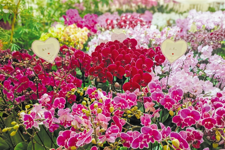 市场里,记者看到,蝴蝶兰色彩纷呈,既有紫粉、粉白等经典花色,也有淡黄、橘粉、浅蓝等特色品种。规格上也兼顾多样需求,从适宜案头摆放的小巧盆型到彰显气派的大型组盆,能够满足各种选购偏好。有的摊位上,不同颜色的蝴蝶兰被冠以不同别称,“满天红”“红豆”“粉天使”“白天鹅”等,细品之下,形象贴切。