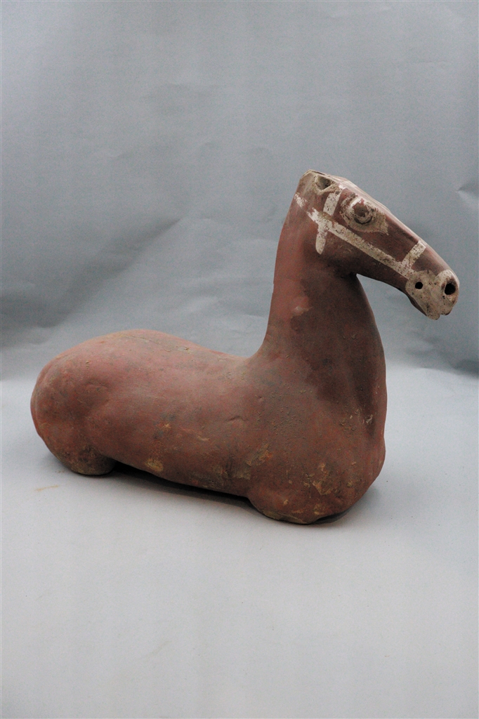陶马以泥质红陶为胎,整体造型饱满雄浑,马头微微昂起,双目有神,双耳机敏,似在凝神静听,又似即将昂首嘶鸣、奋蹄驰骋。马身肌肉紧实,线条遒劲流畅,静中藏动,气韵非凡。与许多色彩繁复的彩绘文物不同,这对陶马仅以纯净的白色线条勾勒马鞍、辔头、络饰等细节,红底白线,对比鲜明,简洁却不失庄重,质朴中透着典雅,堪称古代“极简风”的经典之作。