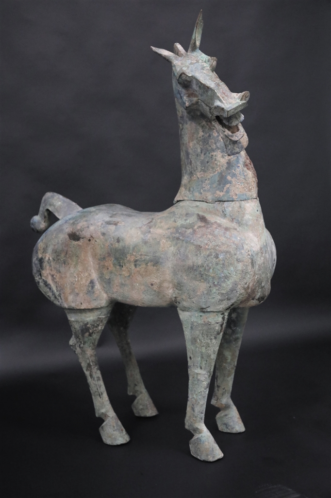 铜马比例精准,肌肉线条饱满遒劲,骨骼强健有力,姿态沉稳却充满爆发力,让人一眼便能感受到千年前骏马奔腾的磅礴气势,是名副其实的“力量美学”。更难得的是,两马出土时并排而立,曲颈之马扭头望向直颈之马,一俯一仰,一静一动,彼此呼应、相互依偎,仿佛在无声交流。这种充满情感与场景感的设计,打破了青铜器物的冰冷坚硬,赋予文物温度与灵性。