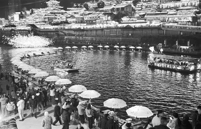 2月17日,游客在湖北省宣恩县城贡水河上观景游玩。