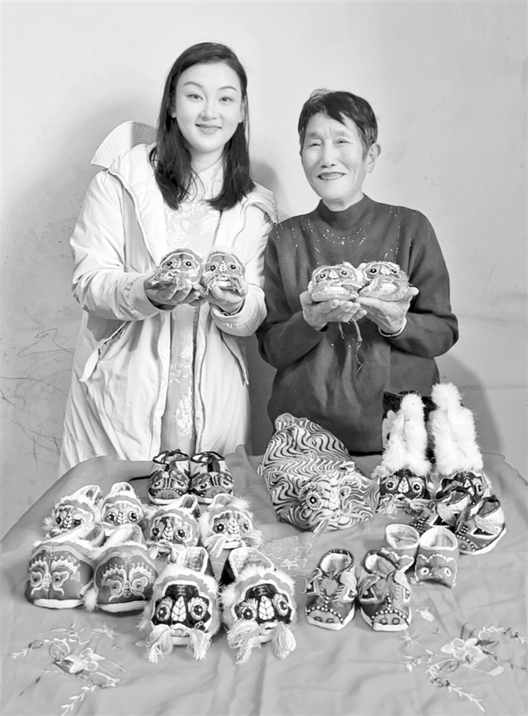 蠡县非遗手工传承人孙贝塔(左)与西齐庄77岁民间虎头鞋制作者魏大茹(右),一同展示虎头鞋和老虎枕等非遗手工艺品。大学毕业的孙贝塔利用业余时间,挖掘拍摄蠡县与周边的葫芦烙画、掐丝珐琅、绒花等多项非遗技艺,进行线上宣传,并开展非遗进校园义务授课,让传统非遗焕发新活力,收获广泛好评。