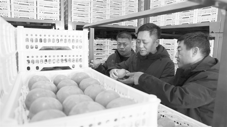 保定沃隆农业发展有限公司董事长郭子龙(中)在查看鲜柿冷冻储藏状况。 郭恩桥 摄