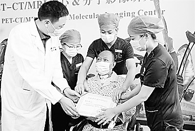 7月21日,国家卫健委医政医管局医疗质量与评价处副处长马旭东(左一)为崔先生颁发了编号为“5510”的“战胜者证书”。