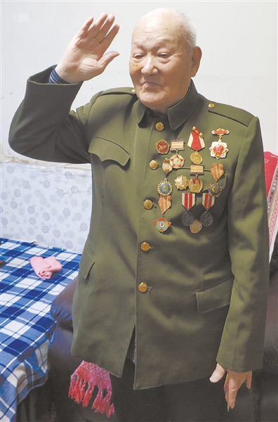王绍明老人胸前戴满军功章。