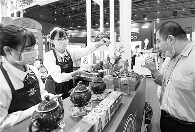 11月7日,在第三届进博会食品及农产品展区英国馆,参观者品尝英国伦敦的亚曼茶。