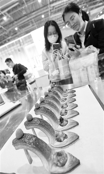 11月7日,在第三届进博会食品及农产品展区乐斯福展台,参观者拍摄一款“高跟鞋”面包。